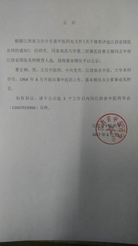 关于推荐江西省国医名师的公示