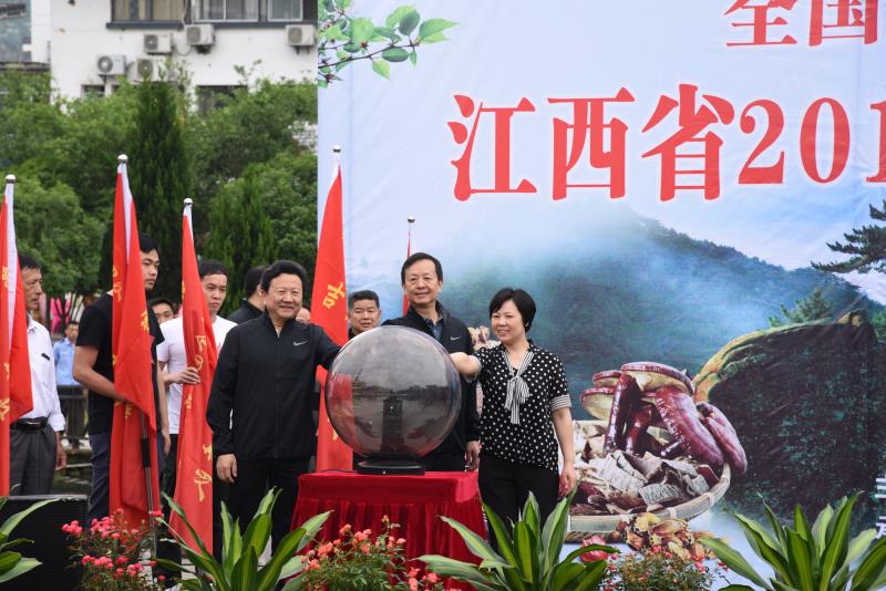 启动仪式上,宜春市副市长蓝亚青代表宜春市作了热情洋溢的致辞,介绍了宜春市丰富的自然资源和悠久的中医药文化底蕴,表达了宜春市将高度重视、精心组织、全力以赴完成各项普查工作的意志和决心。省卫计委党组成员、副主任程关华阐明了中药资源普查工作的重要意义,介绍了江西省中药资源普查以来取得的阶段性成果,对普查县和普查队提了三点希望:一要强化组织保障;二要提升普查实效;三要做好成果转化。我院代表中药资源普查技术依托单位和普查队作了表态发言,决心不辱使命,保质保量完成好中药资源普查工作。丁晓群主任亲自为14个县(市、区)普查队授旗。随后,丁晓群主任、程关华副主任与蓝亚青副市长共同按下启动球,宣布我省中药资源普查工作正式启动。