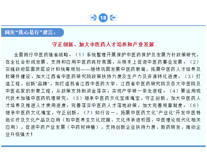 哈志强说,作为一名中医药人,一直关注着江西省中医药产业发展,特别是中医药传承创新和人才梯队建设等方面的热点问题。在院党委积极号召干部职工参与到“我为‘五型’政府建设献一策”这一活动后,他结合自身20余年的中医药行业从业经历,围绕江西中医药产业发展,分别从政策规划、人才培养、科技创新、文化传承、产业培育等方面提出建议。
