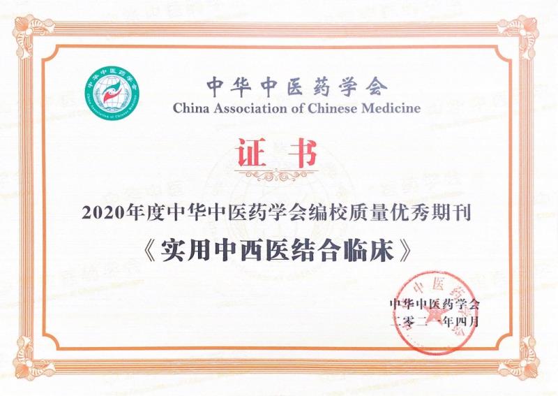 4月23日,由中华中医药学会主办、北京北大方正电子有限公司支持的“中华中医药学会系列期刊2021年度工作会议暨中医药科技期刊创新发展研讨会”在京举行。会上发布了中华中医药学会组织开展的2020年度期刊编校质量的审读结果,《实用中西医结合临床》杂志荣获2020年度中华中医药学会编校质量优秀期刊奖项。
