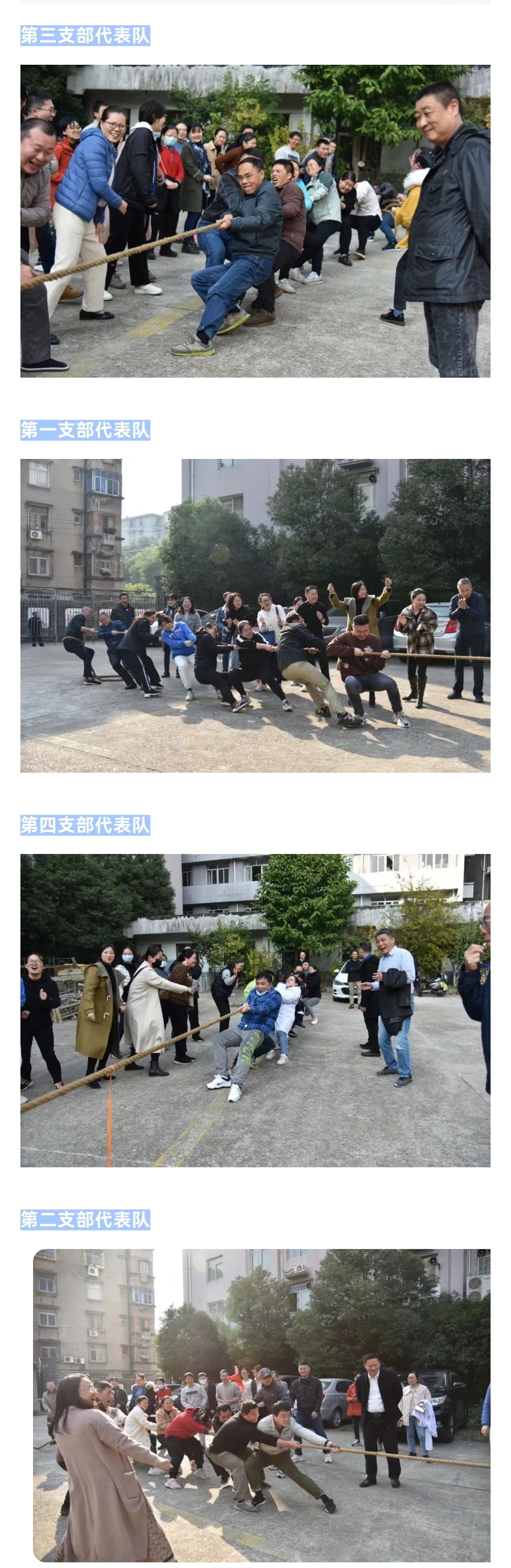 13时50分,4支拔河队伍齐刷刷整装待命,摩拳擦掌,此次拔河比赛第一轮淘汰赛将于14时拉开序幕。比赛场处处洋溢着兴奋而欢乐的气氛,组织人员和拉拉队呐喊声不绝于耳。比赛采取淘汰与循环相结合方式进行。随着裁判的一声哨响,两组4队比赛同时拉开战幕,每队队员众志成城,团结一心,奋力使劲,不甘示弱,以团结友爱、顽强拼搏的精神投入比赛。场边啦啦队欢呼声、呐喊声、加油声、助威声响成一片,此起彼伏。经过约1小时的激烈角逐,第三支部代表队荣膺桂冠,第一支部代表队、第四支部代表队分别取亚军和季军。