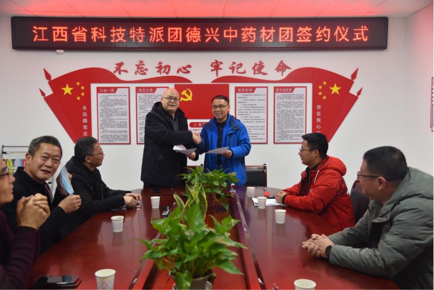 “德兴中药材团”与德兴市科技局及江西天海科技发展集团有限公司、江西福圣元生物科技有限公司、江西大茅山生物科技有限公司、德兴市百草园生态健康养生有限公司以及江西圣城实业有限公司5家企业签订科技服务协议;“横峰中药材团”分别与江西千丰中药材开发有限公司、江西信前胡中药开发有限公司、横峰县子妍种养专业合作社3家企业及合作社签订科技服务协议。
