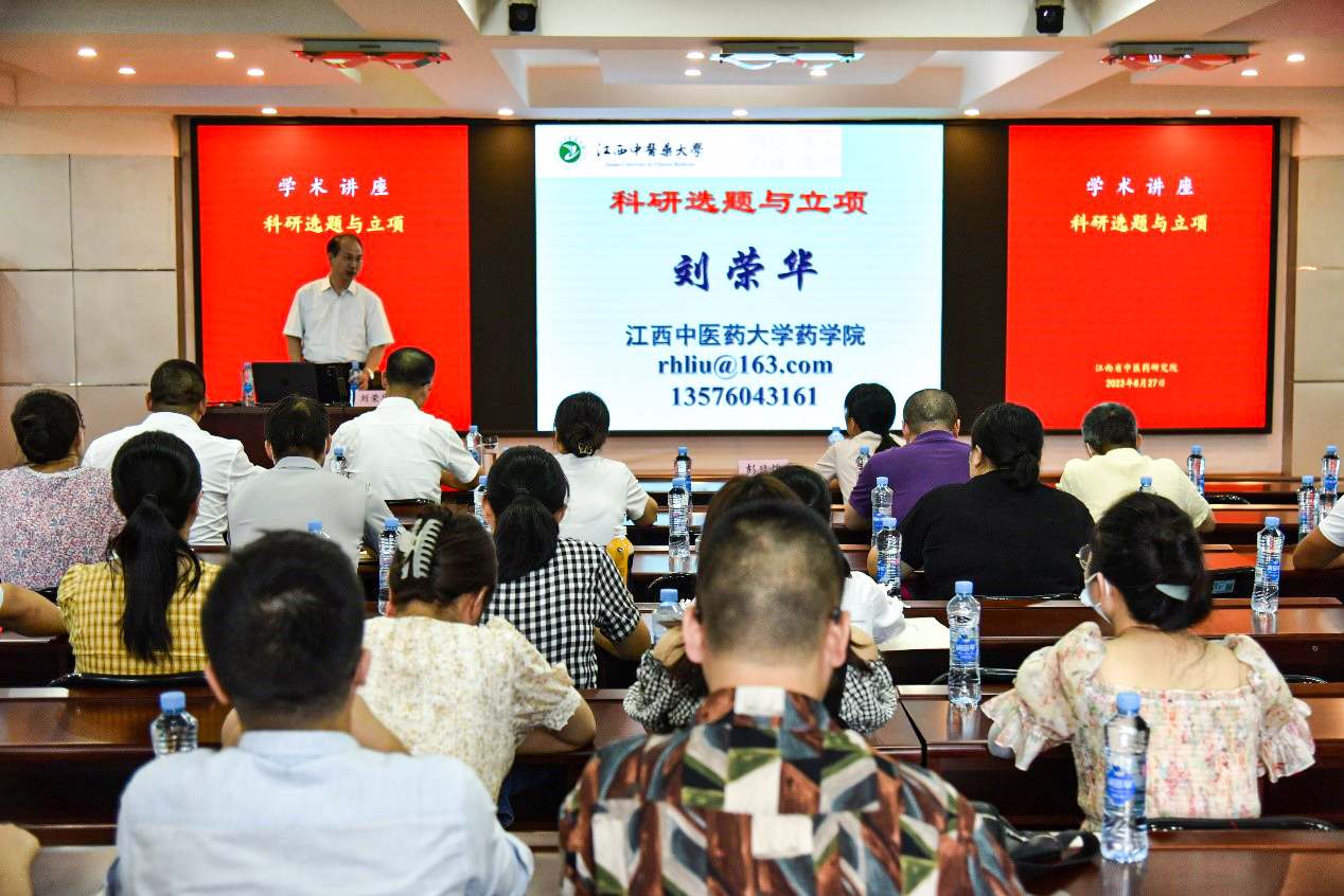 为提高科研项目申报水平,营造良好学术氛围,我院于8月27日特邀江西中医药大学药学院院长刘荣华教授作题为“科研选题与立项”的学术讲座。讲座由我院副院长虞金宝主持,院长彭日煌参加了此次讲座,全院专业技术人员到场聆听。