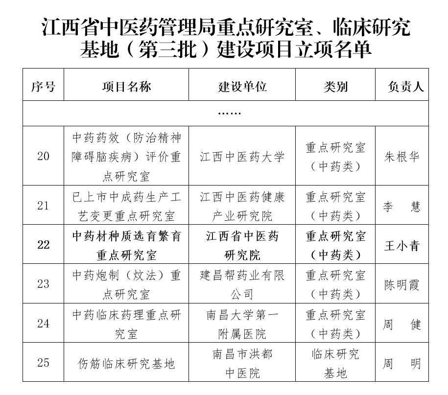 近日,江西省中医药管理局公布了江西省中医药重点研究室、临床研究基地(第三批)建设项目名单,我院申报的中药材种质选育繁育重点研究室成功入选。