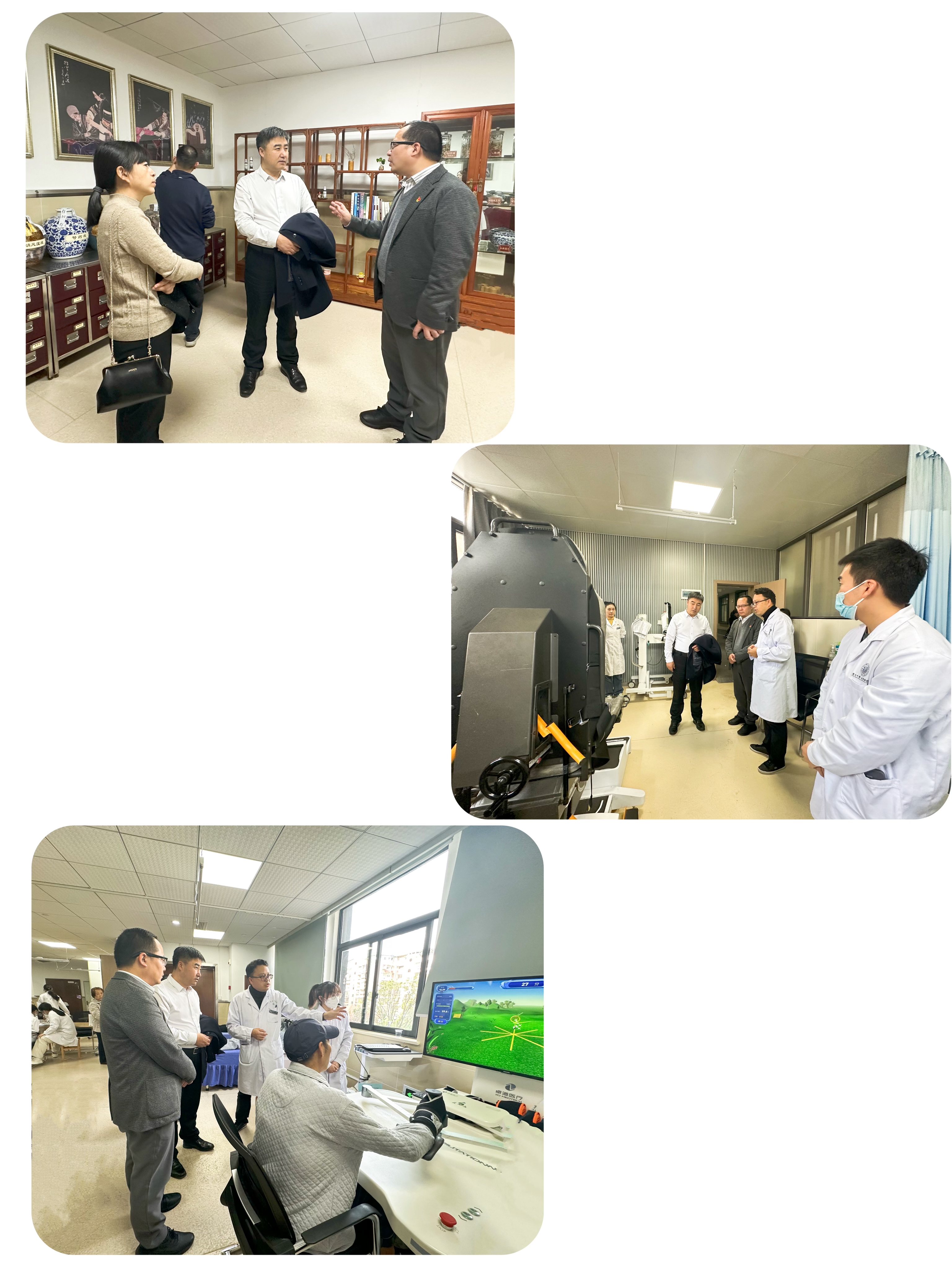 李士虎、彭日煌一行先后实地参观了民医馆、国医堂、皮肤科、苗医科、中医药房、康复大厅等地,现场了解了各科室的服务模式、运营机制及管理情况,双方还就民医馆建设、中医药智能化发展、苗医特色疗法、中医诊疗技术等内容展开了深入交流与探讨。