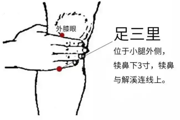 ①足三里(健脾第一要穴): 外膝眼下四横指,胫骨旁一横指。按揉或艾灸,强健脾胃,化湿要穴。